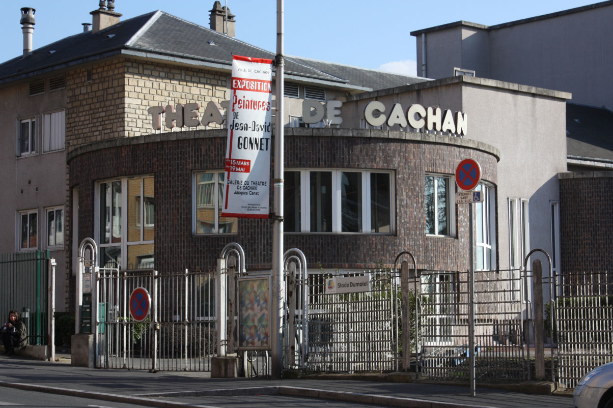 Entrée du théâtre de Cachan et bannière de l'exposition